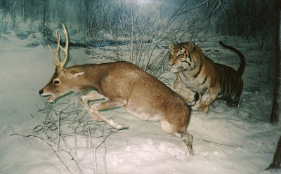 Creeping to within 10-25 metres of its victim, the tiger will suddenly pounce and grab the prey by the back of its neck with its feet still planted firmly on the ground.